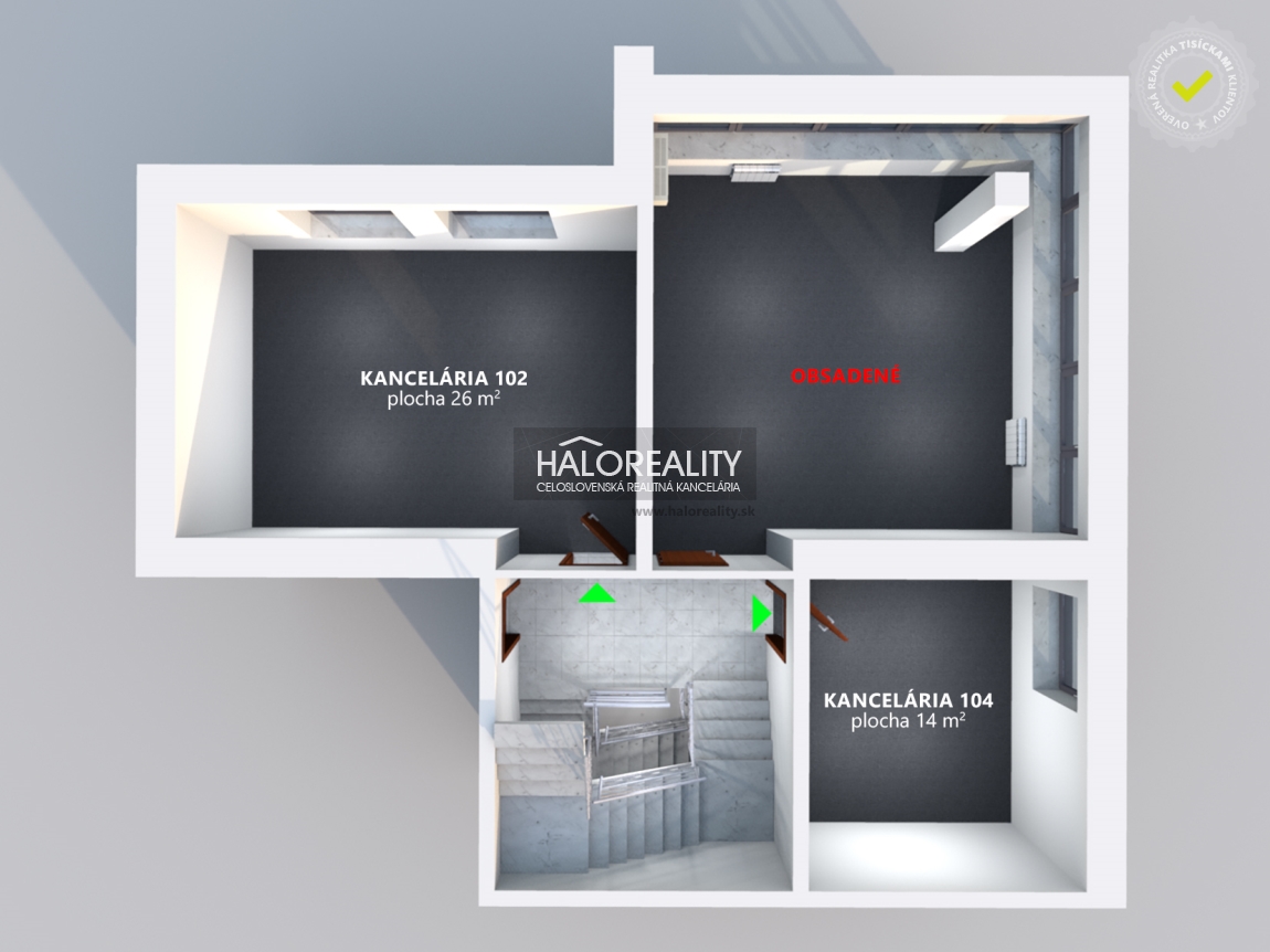 2 kancelárie jedna s plochou 26 m² a druhá s plochou 14 m² svetlá s oknami. Dispozíciu si pozrite na 3D pôdorysoch vo foto-galérii.